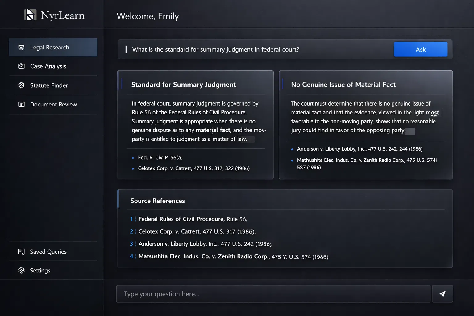 Purpose-built UI for legal research and learning with professional, academic aesthetic.
